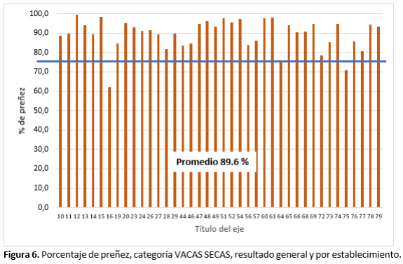 El resultado de preñez general en la categoría vacas secas fue de 89.6 %. Sobre un total de 12.860 vientres tactados. En este caso, también, fue un buen resultado teniendo en cuenta que en esta categoría no solo están vacas secas del año anterior, sino también las vacas, ex vaquillas de entore 18 meses en el otoño anterior. Al igual que en las categorías anteriores si bien el promedio general de la categoría es ese, numerosos campos están por sobre esa media y en algunos casos cercanos al 100 % de preñez. Figura 6.