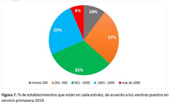 Se analizó la información de los resultados en función del estrato de los productores, se tomó hasta 200 vientres puestos en servicio, de 200 a 500 vientres, de 501 a 1000, de 1001 a 2000 y, por último, más de 2000. En la figura 7, se muestra el porcentaje de establecimientos que estaban en cada estrato.