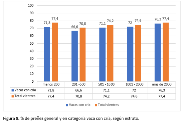 En los establecimientos estratificados se analizó el porcentaje de preñez general; y en la categoría vacas con cría, el objetivo fue conocer la situación reproductiva en cada estrato y observar si el estrato condiciona. (Figura 8)