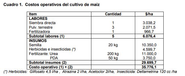 En el cuadro 1 se muestran los costos de implantación y protección del maíz en el sudeste de la provincia en siembra directa con nivel tecnológico medio y considerando el uso de maquinaria propia.