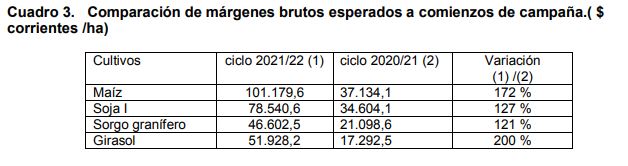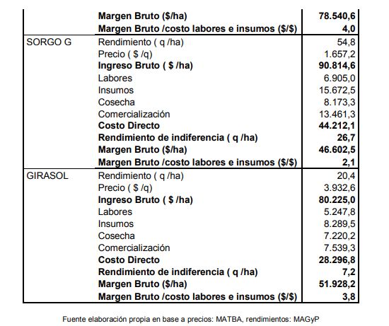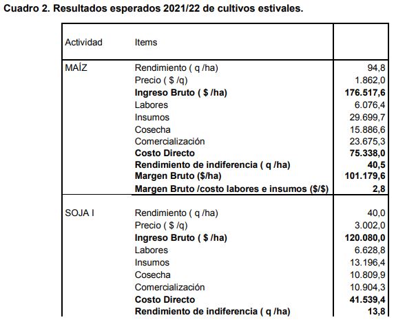La variación respecto al informe anterior de junio de 2020 da un incremento en el costo de labores del 42 % mientras que en insumos el aumento es de 48 % por lo que el costo operativo total entre ciclos aumentó un 46,7 %, a su vez, el aumento anual del nivel de precios mayorista (INDEC,2021) se estima en 65,9 %. De acuerdo a ello puede afirmarse que el costo operativo decreció levemente respecto a los valores del ciclo pasado en términos reales al momento del informe. En el cuadro 2 se muestran los indicadores económicos esperados de los cuatro cultivos de cosecha gruesa predominantes y competitivos por el uso del suelo considerando los rendimientos promedio quinquenales en el sudeste de Córdoba.