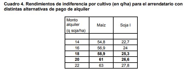 Teniendo en cuenta el índice de inflación ya mencionado (65,9 %) surge que todos los cultivos muestran márgenes esperados reales positivos siendo girasol y maíz los más competitivos. Cabe aclarar que, aunque esta es una situación puntual, las condiciones de alta demanda junto a una moderada oferta esperada (en condiciones climáticas óptimas) hacen que la perspectiva de firmeza en los precios se mantenga a mediano plazo. Para considerar la situación de producción en alquiler en el cuadro 4 se indican los rendimientos de indiferencia de los principales cultivos de verano que igualan el total de costos (implantación, protección, cosecha y comercialización) y posibles pagos de alquiler en quintales de soja /ha, considerando que se paga el precio actual de mercado en soja, neto de gastos de comercialización.