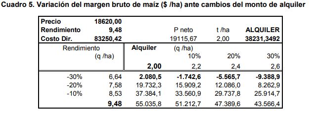 Los rindes de indiferencia, en el promedio de la serie de alquileres representan en maíz el 62 % del rinde zonal y han mejorado (disminuido) un 16 % respecto a los valores del ciclo pasado, esto indica una importante baja del riesgo en el caso del arrendatario para la nueva campaña. En soja de primera, el rinde de indiferencia es el 63 % del rinde medio representando también una baja del 7 % respecto al ciclo anterior. En el cuadro 5 se analiza la sensibilidad del margen del maíz para el arrendatario ante cambio del monto del alquiler y de rindes.