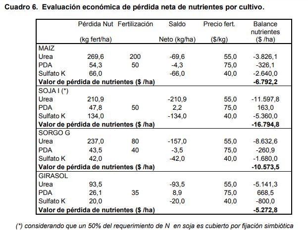 También se observa que se requieren bajas importantes de rinde (30%) y subas de los alquileres para empezar a tener márgenes negativos lo que indica menor incertidumbre en los resultados para el productor que alquila. Considerando el aspecto ambiental en el análisis se calculó el valor de la pérdida de nutrientes. En base a las tablas de pérdida de nutrientes según productividad (IPNI, 2019) los rendimientos medios y las dosis de fertilizantes modales según el nivel tecnológico predominante se calculó el cuadro 6.