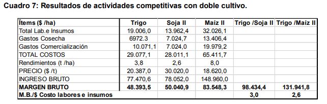 Se muestra la importante pérdida relativa en el cultivo de soja respecto al resto de las actividades mientras que en maíz se compensan parcialmente las extracciones de nutrientes con las dosis medias de fertilizantes aplicados con el manejo modal Teniendo en cuenta la importancia que adquirió el uso del maíz como cultivo de segunda ocupación luego de trigo, por sus ventajas agronómicas para la conservación del suelo, en el cuadro 7 se muestra los resultados económicos respecto al esquema competitivo tradicional del doble cultivo de trigo con soja de segunda. En el caso del Maíz II se ha considerado un manejo similar al modal y un rendimiento en promedio 15 % menor (Vallone P et al, 2017).