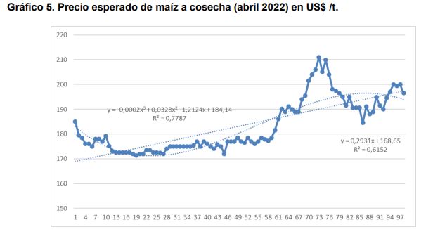 La combinación del doble cultivo trigo/maíz II muestra resultados económicos más eficientes por las relaciones de precios actuales en la rotación aunque el doble cultivo tradicional presenta eficiencia financiera levemente superior en el indicador de retorno por peso gastado. Debe destacarse además el efecto agronómico, tanto en el balance de nutrientes como en el consumo de agua y aporte de materia seca que realizan las gramíneas respecto a la rotación del doble cultivo trigo /soja de segunda (Ghida Daza C, Bollatti P, 2016) En el gráfico 5 se muestran las perspectivas de precio esperado para el nuevo ciclo en maíz, para la posición abril 2022 desde que comenzó a cotizar en enero de 2021.