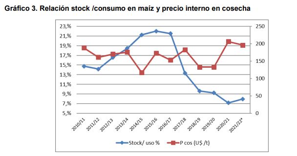 En ambas variables se muestra una tendencia creciente pero en los últimos tres ciclos la demanda superó a la oferta debido al incremento del consumo del sudeste asiático (por la mejora económica de la población) y el mayor consumo de bioetanol fomentado por la legislación que busca mayor protección ambiental en EEUU. Aunque en las primeras proyecciones del nuevo ciclo se espera un mejoramiento leve de los stocks finales los mismos se mantendrían en niveles críticos que, se estima, le darían fortaleza a los precios esperados (WASDE, 2021) En el gráfico 3 se presenta la evolución de la relación stock final /consumo a nivel global.