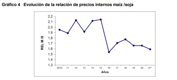 Se muestra una baja importante en la relación en los últimos ciclos por las razones mencionadas y una suba en el precio, especialmente en la última campaña y la proyección del futuro ciclo. Teniendo en cuenta que la superficie sembrada de maíz está ligada a la evolución de la relación de precios con soja, su principal competidor por el uso del suelo, en el gráfico 4 se muestra los cambios en la relación de precios internos entre ambas actividades desde 2010.