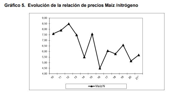 Se muestra una tendencia decreciente que expresa un mejoramiento del precio relativo de maíz respecto a soja (se requiere menos maíz para comprar la misma cantidad de soja). Esto se corresponde con el cambio relativo en el uso del suelo agrícola, tanto a nivel provincial como nacional donde, en el último quinquenio ha aumentado la superficie del cereal debido a la mejora de esta relación de precios. En la proyección del nuevo ciclo se mantiene esta tendencia en los precios esperados. Teniendo en cuenta también la importancia de la relación de precios del maíz con un importante insumo como son los fertilizantes, en el gráfico 5 se muestra la evolución de precios relativos.