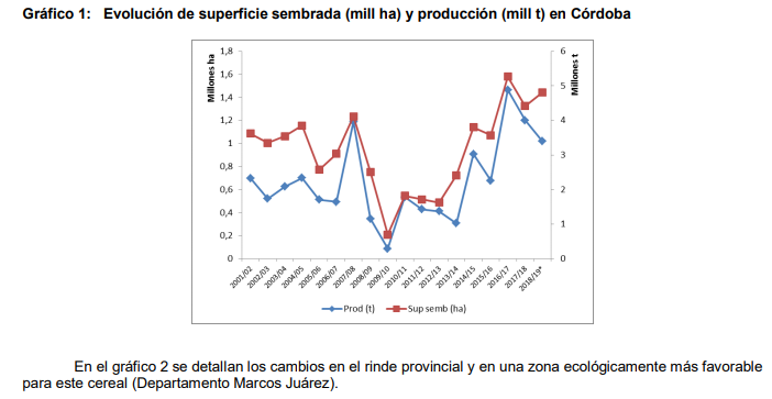 El cultivo de trigo mantiene en el último quinquenio la participación destacada que tenía históricamente en la provincia como opción rentable entre los cultivos agrícolas pampeanos: en el gráfico 1 se muestra la evolución de la superficie sembrada y producción de trigo a nivel de Córdoba desde 2001 (Ministerio de Agroindustria, 2019). Se observa una importante variación entre valores extremos presentando un valor mínimo cercano a trescientas mil toneladas en el ciclo 2009/10 (por problemas climáticos a la siembra y dificultades en la comercialización externa) mientras que el máximo de producción es de cinco millones de toneladas en 2016/17 (favorecido por la eliminación de retenciones y la devaluación de fines de 2015). En el ciclo 2018/19 se muestra una baja mayor en la producción respecto a la superficie sembrada (por déficit hídricos en el ciclo del cereal) pero se mantiene la oferta entre los mayores valores de la serie. Así, la producción promedio en el último trienio superó en un 82 % al valor medio de la serie de las últimas dieciocho campañas.