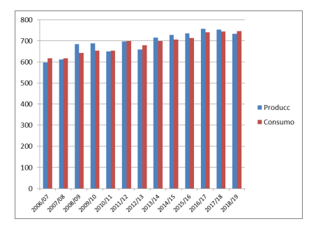 Gráfico 3: Evolución de la producción y el consumo mundial (millones t)