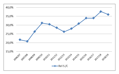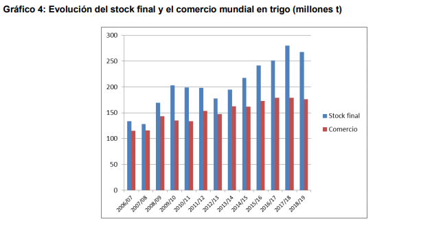 Del gráfico surge que ambas variables se incrementan aunque en distinta escala, de tal forma mientras que el comercio lo hace en 53 % entre extremos el stock final aumenta el 103%. Por ello esto produce una tendencia hacia la baja en los precios esperados ante el aumento del stock en las seis campañas hasta la 2018/19 en que presenta una leve baja, a su vez se observa también el estancamiento del comercio mundial. En el gráfico 5 se muestra la evolución de la relación stock final /consumo.