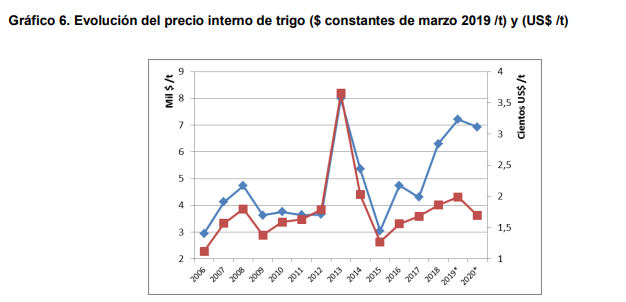 Gráfico 7: Precio esperado a cosecha en trigo (US$ /t), ciclo 2019/20