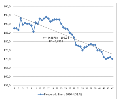 El valor extremo del precio en el 2013/14 fue coyuntural, producido por el déficit de oferta interna por las políticas sectoriales vigentes en esa época, lo cual se subsanó en las campañas siguientes de alta oferta y consiguiente baja del precio. En 2016 se produjo la eliminación de los impuestos a la exportación, por ello la suba en dicho año que no fue más pronunciada debido a la alta oferta mundial. La situación de la producción mundial tiene una tendencia a la suba en los últimos seis ciclos con lo que, a pesar de mejoras en el consumo, la relación stock /consumo pasó de 26,2 % en 2012/13 a 36,2 % en 2017/18 y 36% en 2019/20 lo que mantiene un contexto de baja en el precio esperado que se compensa por la suba del tipo de cambio en 2018 y el primer bimestre de 2019. Esto se observa en el eje derecho del gráfico 6 donde el valor en US$ /t se diferencia en los últimos años de la curva en $ debido a la mayor devaluación del peso, con lo que aumentos leves en US$ significaron variaciones mayores expresadas en moneda local. Esto se ve desde 2018 en adelante. En el gráfico 7 se muestra la evolución del precio esperado para enero 2020 desde que comenzó a cotizar la posición en enero 2019 (MATBA, 2019). Cabe mencionar que, a diferencia de años anteriores, solo después de la cosecha 2018/19 en el mercado de futuros empezó a cotizar esta posición posiblemente por la incertidumbre conjunta de la evolución del comercio de granos ante escenarios de discusiones arancelarias en el mercado mundial y las expectativas de la política cambiaria local.