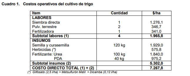Se realizó el cálculo de márgenes económicos siguiendo el esquema tradicional (Gonzalez y Pagliettini, 2006) para evaluar los resultados actuales con respecto a los del año anterior comparando las opciones de cultivos competitivos (maíz y soja de primera) con los precios promedio esperados a cosecha del nuevo ciclo 2019/20 proyectados en la primera quincena de marzo 2019 (Mercado a Término Bs.As, 2019) y los precios de insumos en ese momento (Márgenes Agropecuarios, 2019). A su vez, se consideraron los rendimientos del promedio del último quinquenio del departamento Marcos Juárez (Ministerio de Agroindustria, 2019). De esta forma se evaluó al trigo como integrante de la rotación con soja de segunda, con respecto a maíz o soja de primera siembra comparando a su vez la situación del productor propietario de la tierra y la opción del productor contratista. Posteriormente se agregó al análisis la consideración de aspectos ambientales mediante el esquema de cálculo de balance de nutrientes para determinar los cambios en los resultados económicos (Ghida Daza, 2018) y finalmente, se indican las expectativas del cultivo para el nuevo ciclo.