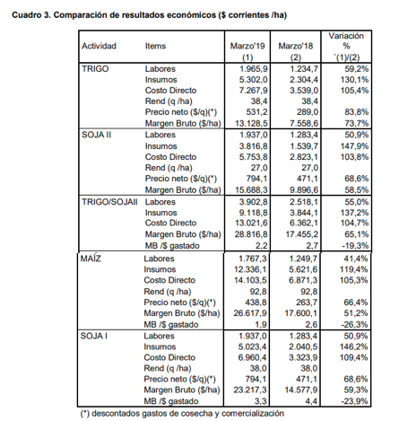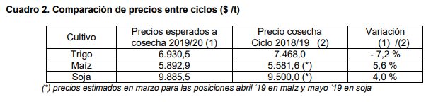 Estos valores representan un aumento del 59 % en el componente labores y del 130 % en insumos con respecto al anterior informe de marzo 2018, lo que da una variación del Costo Directo total de 105 %, teniendo en cuenta que, la variación de precios mayorista (INDEC, 2019) en el período se estima en 64 % surge un incremento del costo directo en términos reales. En el cuadro 2 se comparan las primeras estimaciones de los precios esperados a cosecha 2019/20 (considerando el promedio primera quincena de marzo 2019), con respecto a los precios en cosecha en el actual ciclo 2018/19.