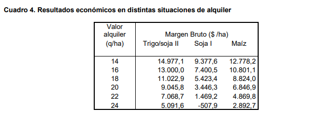 cuadro 4 en que se presentan los márgenes, con rindes promedios, logrados por productores con este tipo de