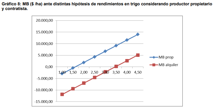 Del cuadro surge que el trigo, en combinación con soja de segunda, supera a las otras opciones presentando el doble cultivo, a su vez, menor riesgo respecto a soja de primera o maíz. La alternativa de alquiler se puede analizar también, en el gráfico 8, considerando el margen obtenido en distintas hipótesis de rendimiento (eje horizontal).