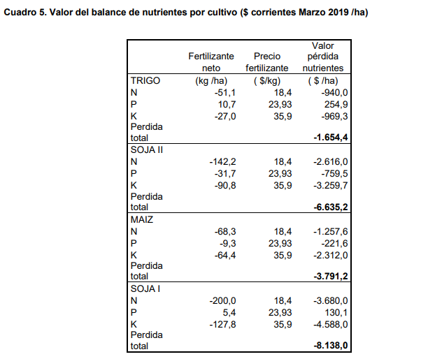 Considerando el pago de un alquiler de 18 quintales de soja /hectárea para el doble cultivo y prorrateando 9 q /ha en el costo de trigo se muestra que, mientras el productor propietario requiere 1,6 t /ha para cubrir los costos de implantación y protección, el rinde de indiferencia para el contratista es de 3,45 t/ha, que casi iguala el valor de productividad media zonal. Esto es indicativo del mayor riesgo asociado a la alternativa de la modalidad de alquiler en valores fijos de producción en lugar de opciones de reparto del riesgo asociadas a pago en porcentaje de la producción. Es de importancia también evaluar la sustentabilidad agronómica de la actividad, para ello se agregó en el análisis el cálculo del valor del balance de nutrientes (VBN), según tablas (IPNI, 2019) para los rendimientos utilizados (Cuadro 5).