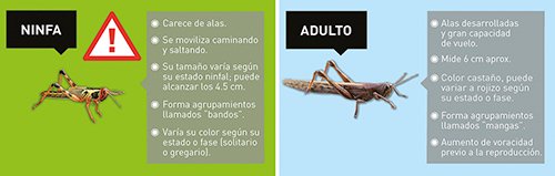 Las langostas pertenecen al orden de insectos ortópteros, poseen patas posteriores largas para saltar y un aparato bucal masticador potente que le permite alimentarse de hojas y de otros órganos de plantas. Asimismo, se caracterizan por su gran capacidad migratoria y alta tasa reproductiva, lo que les confiere el potencial para convertirse en plagas devastadoras y afectar la vegetación de grandes extensiones de terreno.