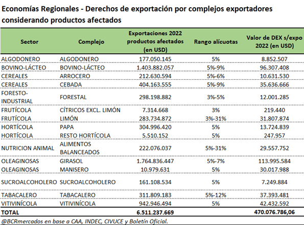 Según el trabajo de la Dirección de Informaciones y Estudios Económicos de la entidad, casi 7 de cada 10 dólares generados por las economías regionales están afectadas por el impuesto. Ello es así porque durante 2022 los diversos complejos exportadores dentro del grupo analizado concretaron despachos por u$s 10.067 millones, con un 65% de dicho valor exportado afectado por alguna alícuota de Derechos de Exportación.