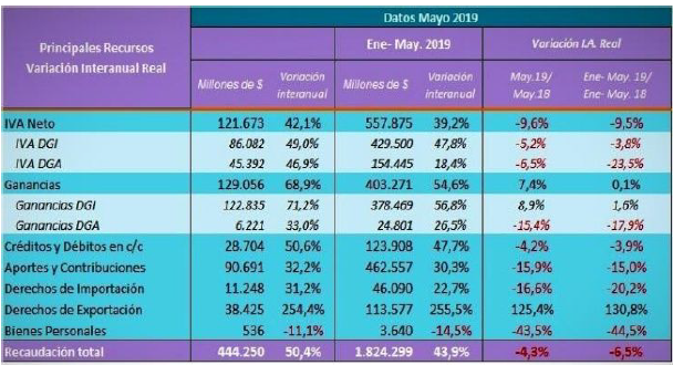 El exponencial crecimiento de los derechos de exportación, sin embargo, empujar la recaudación global por encima de la inflación interanual. Así, el fisco recaudó en mayo $ 444.250 millones, con una tasa de variación con respecto al mismo mes del año 2018 igual a 50,4%, lo que supone un decrecimiento del 4,3% si se considera la variación real interanual.