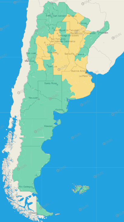 Buenos Aires: Almirante Brown – Avellaneda – Berazategui – Florencio Varela – Lanús – Lomas de Zamora – Presidente Perón – Quilmes – Berisso – Ensenada – La Plata – Este de Castelli – Este de Chascomús – Este de Dolores – Este de Lezama – Este de Magdalena – Este de Punta Indio – Este de Tordillo – Oeste de Castelli – Oeste de Chascomús – Oeste de Dolores – Oeste de General Lavalle – Oeste de Lezama – Oeste de Punta Indio – Oeste de Tordillo – Pila – Este de General Lavalle – La Costa – Pinamar – Sudeste de General Juan Madariaga – Villa Gesell – Ayacucho – Balcarce – General Guido – Maipú – Noroeste de General Juan Madariaga – Noroeste de Mar Chiquita – Oeste de General Pueyrredón – Costa de General Pueyrredón – Costa de Mar Chiquita – General Alvarado – Adolfo Gonzales Chaves – Centro de Lobería – Norte de Coronel Dorrego – Norte de Necochea – Norte de San Cayetano – Norte de Tres Arroyos – Costa de Lobería – Costa de Necochea – Costa de San Cayetano – Costa de Tres Arroyos – Azul – Rauch – Tapalqué – Zona baja de Benito Juárez – Zona baja de Tandil – General La Madrid – Laprida – Olavarría – Florentino Ameghino – General Villegas – Rivadavia – Arrecifes – Capitán Sarmiento – Carmen de Areco – Chacabuco – Colón – General Arenales – General Pinto – Junín – Leandro N. Alem – Lincoln – Pergamino – Rojas – Salto – Baradero – Ramallo – San Nicolás – San Pedro – Alberti – Bragado – Chivilcoy – General Viamonte – Nueve de Julio – Veinticinco de Mayo – Campana – Exaltación de la Cruz – San Antonio de Areco – Zárate – Escobar – San Fernando – San Isidro – Tigre – Vicente López – General Las Heras – General Rodríguez – Luján – Marcos Paz – Mercedes – San Andrés de Giles – Suipacha
