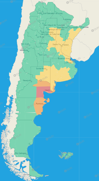 Buenos Aires: Costa de Patagones – Adolfo Gonzales Chaves – Centro de Lobería – Norte de Coronel Dorrego – Norte de Necochea – Norte de San Cayetano – Norte de Tres Arroyos – General La Madrid – Laprida – Olavarría – Azul – Rauch – Tapalqué – Zona baja de Benito Juárez – Zona baja de Tandil – Zona serrana de Benito Juárez – Zona serrana de Lobería – Zona serrana de Necochea – Zona serrana de Tandil – Costa de Lobería – Costa de Necochea – Costa de San Cayetano – Costa de Tres Arroyos – Adolfo Gonzales Chaves – Centro de Lobería – Norte de Coronel Dorrego – Norte de Necochea – Norte de San Cayetano – Norte de Tres Arroyos – Brandsen – Cañuelas – Oeste de Magdalena – San Vicente – Berisso – Ensenada – La Plata – Almirante Brown – Avellaneda – Berazategui – Florencio Varela – Lanús – Lomas de Zamora – Presidente Perón – Quilmes – Esteban Echeverría – Ezeiza – La Matanza – Merlo – General Las Heras – General Rodríguez – Luján – Marcos Paz – Mercedes – San Andrés de Giles – Suipacha – General San Martín – Hurlingham – Ituzaingó – José C. Paz – Malvinas Argentinas – Moreno – Morón – Pilar – San Miguel – Tres de Febrero – Campana – Exaltación de la Cruz – San Antonio de Areco – Zárate – Escobar – San Fernando – San Isidro – Tigre – Vicente López – Baradero – Ramallo – San Nicolás – San Pedro –