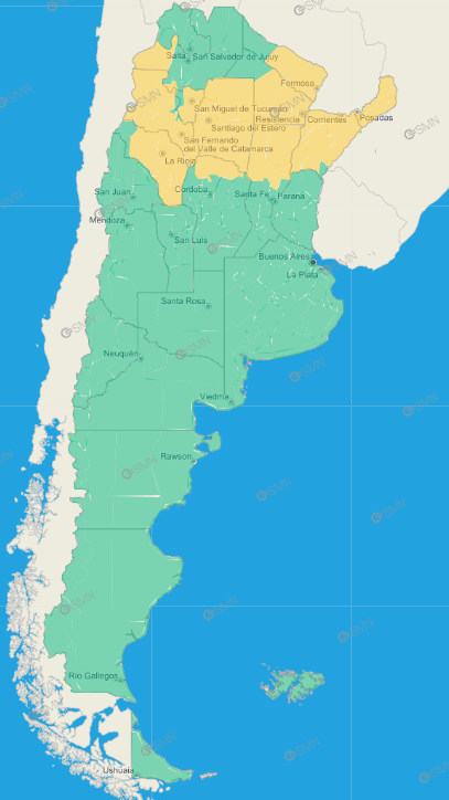 Salta: Cordillera de Los Andes – Burruyacú – Capital – Cruz Alta – Famaillá – Graneros – La Cocha – Leales – Simoca – Trancas – Yerba Buena – Zonas bajas de Chicligasta – Zonas bajas de Juan Bautista Alberdi – Zonas bajas de Lules – Zonas bajas de Monteros – Zonas bajas de Río Chico – Zonas bajas de Tafí Viejo