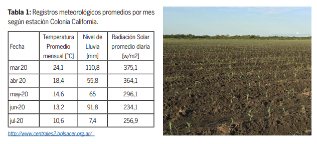 Este ensayo comparativo de rendimiento constó de 9 tratamientos, cada uno de los cuales correspondió a un híbrido de maíz comercial. Cada tratamiento se sembró a 70 cm de distancia entre surcos elevados en macroparcelas de 27 metros de ancho por 200 metros de largo. La cosecha se realizó en cuatro estaciones de muestreos de 10 m2 cada una al azar por cada tratamiento. El lugar del ensayo fue el Campo Experimental (30°29’58.84”S; 59°55’52.23”O) de la Asociación de Técnicos Arroceros de la provincia de Santa Fe. El trabajo se desarrolló durante la campaña 19/20 en condiciones normales. Se destaca la importancia de contar con una estación meteorológica total en el sitio de ensayo. En la Tabla 1 se muestran datos meteorológicos relevantes obtenidos por la estación.