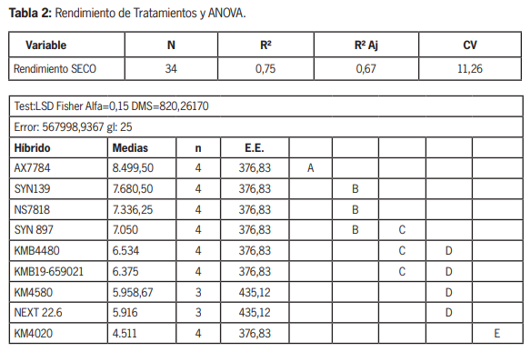 En la Tabla 2 se presentan los rendimientos de los distintos híbridos de maíz evaluados, donde se les realizó el análisis de la varianza (ANOVA) y las medias se compararon con el test de LSD Fisher al 15% de probabilidad.