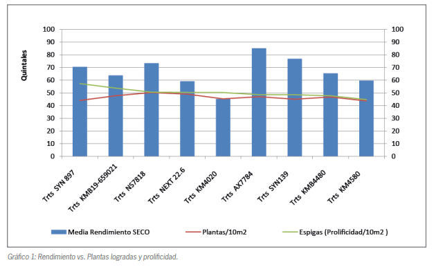 El trabajo comenzó con la preparación del suelo mediante rastra de discos, rastra de dientes y rolo previo a la siembra, la cual se realizó el 10/02/2020. Se utilizó sembradora Tanzi Special 3, con kit de dosificadores Geronci Junior a 70 cm de distanciamiento entre surcos. La densidad de semillas implantadas fue de 52 mil semillas por hectárea con fertilización de base dividida en la línea y en el entre surco de 90 kg/ha de fosfato diamónico (DAP). Luego en V6 (escala fenológica usada Ritchie y Hanway, 1982) se re-fertilizó con 145 kg/ha de urea en bandas incorporadas con carpidor. El lote fue tratado dos veces con insecticida, la primera en V4 (mezcla comercial de Abamectina 0,18% – Lufenurón 1,5% – Bifentrín 1,8%) dosis de 1 lt/ha de acuerdo a marbete en mezcla con herbicidas para el control de malezas y la segunda aplicación en V9-V10 (Bifentrín 10% ) dosis de 200 cc/ha según marbete, esta última en mezcla con fungicida (mezcla comercial de Azoxistrobina 20gr + Cyproconazole 8gr) en dosis de 400 cc/ha. Luego, el 31/03/2020 al inicio de la etapa reproductiva (R1- R2) se registró incidencia y severidad de tizón del maíz (Exserohilum turcicum), también incidencia de cogollero (Spodoptera fugiperda). La cosecha comenzó el 15/07/2020. Se tomaron aleatoriamente dentro de cada macroparcela 4 sitios de muestreos y se cosecharon 10 m2. De cada sitio se tomó: cantidad de plantas logradas y cantidad de espigas logradas. Luego se trilló con una trilladora estática, se pesó, se tomó humedad y se corrigió su peso a humedad comercial (13,5%H).