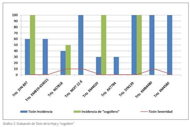 Con respecto al Gráfico 2 se destaca la importancia de la información que brinda la evaluación a campo sobre una de las principales enfermedades de los maíces tardíos, como es el tizón del maíz. Así también permite observar y registrar el comportamiento de los diferentes eventos genéticos sobre el control de lepidópteros.