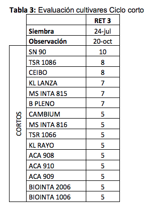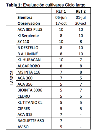 En el presente informe se trata de caracterizar a los cultivares más afectos (con 5 o más de afectación) por el patógeno y que están divididos por ciclo de crecimiento (Tablas 1, 2 y 3).