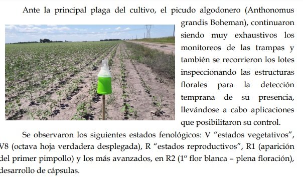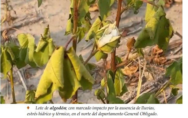 La condición del cultivo continuó siendo muy variable, dependiendo del nivel de precipitaciones ocurrido en cada zona, siendo la parte norte de los departamentos General Obligado y Vera, los más perjudicados. Con el transcurso de los días el deficit hidrico siguió impactando a los algodonales, por lo que se constataron situciones irreversibles. Los daños más importantes ocurrieron en el número de cápsulas retenidas y la caída prematura de hojas, escaso crecimiento y generación de estructuras reproductivas, lo que se vería reflejado directamente en los rendimientos finales. Las aplicaciones de herbicidas y reguladores de crecimiento se realizaron en las zonas donde la condición de humedad en los perfiles de los suelos se normalizó parcial y puntualmente. En el norte del departamento General Obligado, por la falta de agua o por las elevadas temperaturas, no se concretaron.