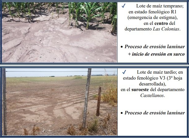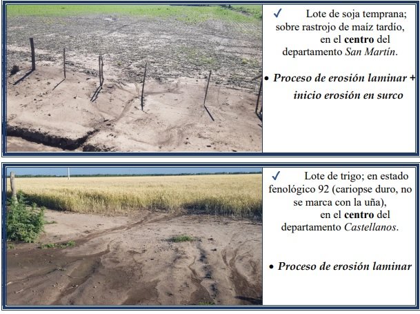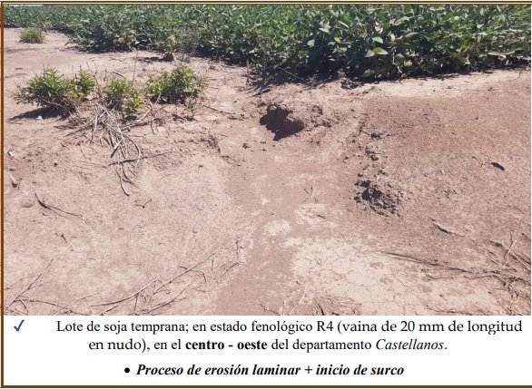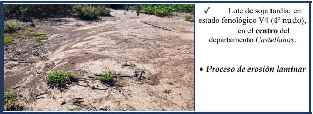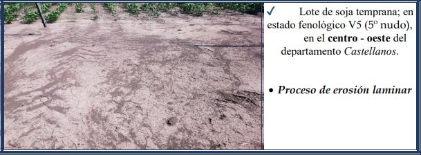 Erosión hídrica laminar o leve, varía de ligera a severa, es muy poco evidente en el campo a primera vista, pero con la pala, en pequeñas transectas se determina la variación en el espesor del horizonte superficial. Dicho proceso es cambiante en cortas distancias a lo largo de una pendiente. El impacto de la gota de lluvia sobre los agregados del suelo, no protegidos, inicia el proceso de desintegración del mismo, el que continúa – luego de que el suelo se ha saturado – con el flujo superficial de escorrentía en un arrastre del material, como se observa en las fotografías expuestas, en los lotes con distintos cultivos.