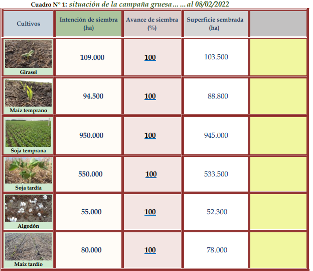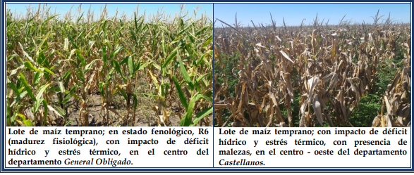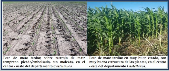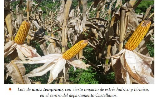 El cultivo de maíz tardío o de segunda, tuvo un período de siembra complicado y ante los escenarios climáticos que se presentaron desde mitad de diciembre del 2021 hasta inicios de febrero del 2022, en los distintos departamentos del SEA, el lapso de siembra, estuvo regulado y condicionado fundamentalmente, por las precipitaciones y la disponibilidad de agua útil en la cama de siembra de los perfiles de los suelos. Por ello, se encontró a los cultivares en una amplitud vegetativa importante, en que sus estados fenológicos oscilaron desde: V “estados vegetativos”, Ve (emergencia), V1 (1º hoja desarrollada), V2 (2º hoja desarrollada), V3 (3º hoja desarrollada), V4 (4º hoja desarrollada), V5 (5º hoja desarrollada) y V6 (6º hoja desarrollada)