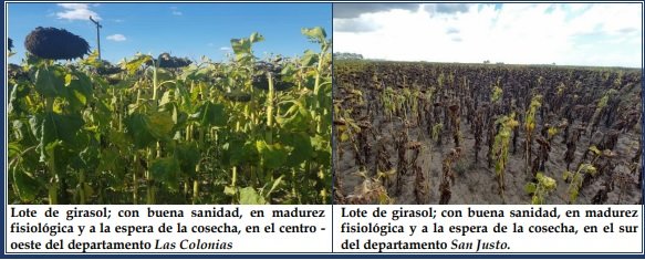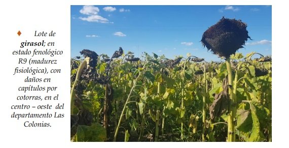Semana donde el proceso de cosecha del girasol tuvo continuidad y un ritmo que progresó lento, pero sostenidamente con el transcurso de los días, en los lotes maduros. El período de recolección de la oleaginosa, durante la campaña 2021-2022, se demoró y amplió, como consecuencia de la prolongación de la fecha de siembra. En general, los rendimientos promedios se mantuvieron o fluctuaron entre valores mínimos de 10 – 12 a 14 qq/ha y máximos de 30 a 32 qq/ha, con lotes puntuales de 34 qq/ha. Los mismos fueron vistos por el sector productivo como interesantes, buenos a muy buenos. Pero, manifestando la inquietud por la numerosa presencia de palomas o cotorras, que afectaron y afectarían los capítulos florares. Realidad constante en cada campaña, con aumento de los daños y perjuicios sobre los rendimientos. Se observó el siguiente estado fenológico: R “estados reproductivos”, R9 “madurez fisiológica” (parte de atrás del capítulo y las brácteas de color amarillento a marrón oscuro)