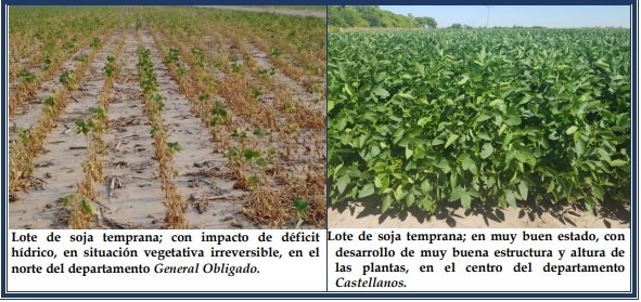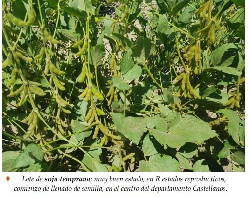 Se consolidaron un 90 % de los cultivares de soja temprana que reaccionaron favorablemente ante los cambios de las condiciones climáticas. En el 10 % restante del área implantada, el impacto de la ausencia de precipitaciones y el elevado régimen térmico durante los primeros 16 días del año, dejaron indicadores muy marcados, tales como, limitaciones en el crecimiento de las plantas, amarillamiento o marchitamiento de las hojas basales y en lotes puntuales, la pérdida de ejemplares por mortandad, realidad irreversible. Se reitera lo enunciado en el informe anterior: Se detectó la presencia de orugas, realizándose aplicaciones de control. 12 En la semana, en el relevamiento a campo en distintas áreas de los departamentos, se observó que dichas aplicaciones fueron eficientes y en un alto porcentaje atenuaron o controlaron las invasiones. Pero, además prosiguieron diariamente los monitoreos de los sembradíos, ante nuevos ataques o presencia de orugas. Se observaron los siguientes estados fenológicos: V “estados vegetativos”, V8 (8º nudo), V9 (9º nudo), R “estados reproductivos”, R1 (inicio de floración), R2 (floración con uno de los nudos superiores con hojas desarrolladas), R3 (vaina de 5 mm de longitud en nudo), R4 (vaina de 20 mm de longitud en nudo) y los más avanzados, en R5 (comienzo de llenado de semilla en nudo).