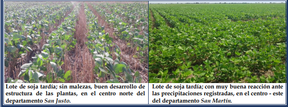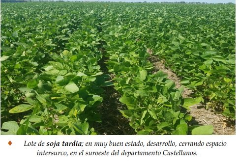 En las recorridas y chequeos de campo efectuados en la semana, se constató que un 70 % de los cultivares de soja tardía reaccionó favorablemente ante el cambio de las condiciones ambientales, tuvo buen crecimiento o desarrollo de las estructuras de las plantas y en un importante número de lotes, se llegó a cierres parciales o totales de los surcos. Un 20 % reaccionó más lentamente, dadas las precipitaciones irregulares y la etapa fenológica en que se encontraban y el 10% restante se detectó en situación irreversible, con pérdida de plantas por mortandad, especialmente en los lotes de limitaciones edáficas en sus suelos. Al igual que en lo enunciado en el cultivo de soja temprana, las aplicaciones de insecticidas ante el ataque de orugas fueron en general eficientes, pero no deberían abandonarse los controles periódicos para la obtención de mejores resultados. También se aplicaron herbicidas, para el óptimo manejo de las malezas. 13 Se observaron los siguientes estados fenológicos: V “estados vegetativos”, V3 (3º nudo), V4 (4º nudo), V5 (5º nudo), V6 (6º nudo), V7 (7º nudo) y los más avanzados, en R “estados reproductivos”, R1 (inicio de floración).