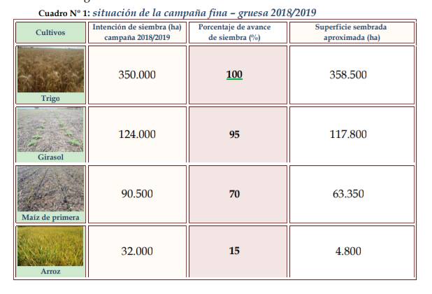 Comenzó una nueva campaña para el cultivo, la primera quincena fue el período donde los primeros productores pusieron en movimiento los equipos y sembradoras, aprovechando cierta humedad en los suelos. La intención de siembra sería similar a la superficie sembrada en la campaña anterior vale decir, unas 32.000 ha. La evolución del proceso de siembra en el área arrocera fue lenta en los últimos días, por la disminución del agua útil en los primeros 5 a 6 cm de la cama de siembra. Lográndose hasta la fecha un progreso del orden del 15 % sobre lo proyectado, representado 4.800 ha. Se espera por parte del sector un acomodamiento de los valores comerciales dado el movimiento y fluctuación del dólar, que haga competitivo al arroz con la cotización internacional.