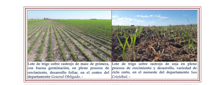 Finalizó el proceso de siembra, lográndose una superficie sembrada de unas 358.500 ha aproximadamente, unas 8.500 ha por sobre la intención inicial. Las buenas condiciones ambientales en toda el área, la disponibilidad de agua útil en la cama de siembra y los aspectos comerciales que se evidenciaron y sostuvieron desde el comienzo, fueron las características que identificaron la presente campaña. Desde el inicio hasta la fecha la totalidad de lo implantado ha tenido una buena a muy buena germinación, logrando un muy buen stand de plantas, crecimiento, desarrollo de hojas y sistema radicular, destacándose la calidad de las semillas utilizadas en las distintas variedades de ciclo largo, intermedio y corto Se estuvo terminando el ajuste de los diferentes planes y estrategias de fertilización, que se harían con la mayor eficiencia y eficacia posible. No se detectó la presencia de enfermedades ni plagas. Se observaron, los siguientes estados fenológicos: 0 “germinación”, 07 (emergencia del coleóptilo), 09 (hoja en el extremo del coleóptilo), 1 “crecimiento de la planta” 11 (primera hoja desarrollada), 12 (dos hojas desarrolladas), 13 (tres hojas desarrolladas), 14 (cuatro hojas desarrolladas), 2 “macollaje” 21 (un tallo principal y un macollo) y unos pocos lotes más avanzados, en muy bajo porcentaje 23 (un tallo principal y tres macollos).