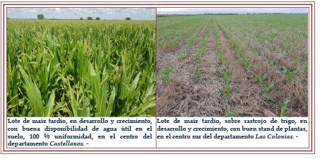 Sin grandes cambios o variaciones los cultivares continuaron bajo condiciones óptimas de humedad y temperatura su desarrollo y crecimiento, sin inconvenientes ni problemas sanitarios. En un 90 % se encontró en estado bueno a muy bueno y un 8 % se encontró afectado por los excesos hídricos, con ciertos grados de recuperación debido a las condiciones climáticas de la semana y un 2 % con consecuencias irreparables. En las áreas de influencia de las cuencas lecheras se continuó con la realización de las tareas de picado de cultivares de sorgo, con buenos resultados en cuanto a calidad y cantidad, a ritmo lento y de acuerdo a los estados fenológicos. Se observaron los siguientes estados: estado 1 (3º hojas), estado 2 (5°hoja totalmente extendida), estado 3 (diferenciación de meristemas), estado 4 (hoja bandera visible), estado 5 (estado de bota o buche), estado 6 (floración), estado 7 (grano lechoso) y los más avanzados en estado 8 (grano pastoso).