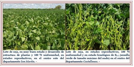 Fue normal el desarrollo y progreso de los estados reproductivos, bajo muy buenas a excelentes condiciones, con muy buena disponibilidad de agua útil, temperaturas medias diarias y horas de sol, evidenciando muy buenas estructuras de plantas y uniformidad de lotes. Se mantuvieron en un 80 % los cultivares en estado bueno a muy bueno, con lotes excelentes, un 8 % en estado bueno a regular y el 12 % restante, en estado regular a malo, manifestando el impacto y los inconvenientes, especialmente en las áreas deprimidas y bajas topográficamente. En referencia a la condición sanitaria, hasta la fecha, no se han presentado inconvenientes y viene todo bajo control, con monitoreos y seguimientos. Se observaron, los siguientes estados fenológicos: V7 (7º nudo) y V8 (8º nudo), V9 (9º nudo), R “estados reproductivos”, R1 (inicio de floración), R2 (floración con uno de los nudos superiores con hojas desarrolladas), R3 (vaina de 5 mm de longitud en nudo), R4 (vaina de 20 mm de longitud en nudo) y lotes más avanzados en R5 (comienzo de llenado de semilla en nudo, semilla de 3 mm de longitud) y R6 1 (semilla verde de tamaño máximo del nudo).