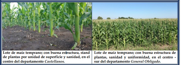 La ideal disponibilidad de agua útil en los suelos, como consecuencia de las últimas lluvias de las semanas anteriores, la amplitud térmica entre el día y la noche, posibilitaron que los cultivares de maíz continuasen expresando todo su potencial genético, desarrollándose sin inconvenientes y evidenciando muy buenos estados, con algunos lotes excelentes. La sanidad de los sembradíos se encontró muy bien, sin presencia de plagas ni enfermedades. Se observaron los siguientes estados fenológicos: V “estados vegetativos”, V3 (3º hoja desarrollada), V4 (4º hoja desarrollada), V5 (5º hoja desarrollada), V6 (6º hoja desarrollada), V7 (7º hoja desarrollada), V8 (8º hoja desarrollada), V9 (9º hoja desarrollada), V10 (10º hoja desarrollada), Vt (panojamiento), R “estados reproductivos”, R1 (emergencia de estigma) y los más avanzados, en R2 (cuaje ampolla).