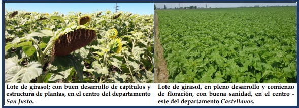 Semana donde en general, los girasoles presentaron muy buen estado, desarrollándose en forma normal y con adecuado contenido de humedad en los perfiles de los suelos. Los días soleados permitieron el trabajo de los insectos polinizadores en los lotes sembrados en fechas más tempranas y que transitaban el proceso de floración. En cuanto al aspecto sanitario, hasta el momento no se detectaron plagas ni enfermedades, pero prosiguió el monitoreo de los predios, por posible presencia de orugas cortadoras (Agrotis spp) y también se los continuó analizando minuciosamente, para la detección temprana del mildew (Plasmopara halstedii). Se observaron los siguientes estados fenológicos: V “estados vegetativos”, V7 (7º par de hojas verdaderas), V8 (8º par de hojas verdaderas), V9 (9º par de hojas verdaderas), R “estados reproductivos”, R2 (distancia de menos de 2 cm entre la inserción del botón floral y la última hoja), R3 (distancia de más de 2 cm entre la inserción del botón floral y la última hoja), R5 “antesis”, R5 – 1 (inicio de antesis) y los más avanzados, comienzo de R5 – 5 (mitad de floración, 50 %. El % depende del área del capítulo cubierto por flores, cantidad de círculos)