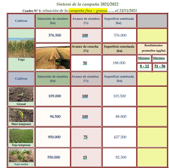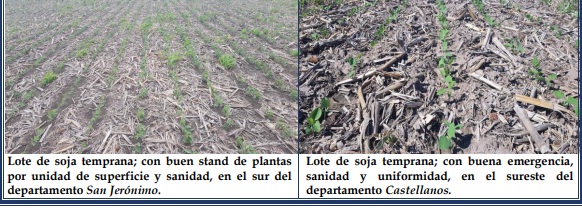 Para la campaña de cosecha gruesa 2021-2022, la intención de siembra de soja temprana se estimó en unas 950.000 ha, con un incremento del 1,5 al 2 %, en referencia a la superficie alcanzada el año anterior, que fue de 935.000 ha. Hasta la fecha se logró un grado de avance en el proceso de implantación del 75%, unas 712.500 ha. Los cultivares presentaron muy buen estado, con un normal crecimiento, lográndose una correcta germinación y emergencia, dadas las buenas condiciones ambientales ocurridas desde el inicio de la misma. Se observaron los siguientes estados fenológicos: V “estados vegetativos”, VE (emergencia), Vc (estado de cotiledón, hojas unifoliadas pegadas), V1 (1º nudo) y V2 (2º nudo).
