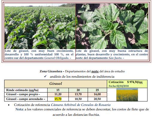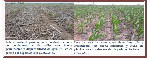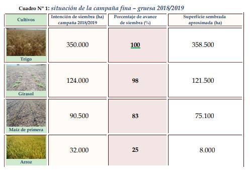 a) la continuación del proceso de siembra de girasol, maíz de primera y arroz, siempre que las condiciones de los suelos lo fueron permitiendo, favorecido por las óptimas condiciones ambientales y la buena disponibilidad de agua útil en la cama de siembra.