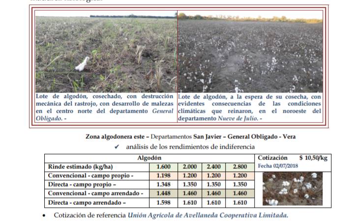 El proceso de cosecha logró un avance hasta la fecha del 90 %, con un progreso intersemanal de 8 puntos y un retraso de 10 puntos porcentuales en referencia al ciclo anterior. El mismo continuó a buen ritmo en el sector oeste del área algodonera de la provincia de Santa Fe, debido a los días soleados y a las condiciones climáticas de estabilidad en la mayoría del período. Con rendimientos promedios que fluctuaron 3 entre 1.000 a 1.800 kg/ha, evidenciando una disminución de lo que se vino recolectando y con diferentes grados de afectación en la calidad, por las condiciones ambientales registradas. Se recuerda la necesidad de la destrucción de los rastrojos, que deberían haberse desgradado, ya que las fechas límites para dicha tarea fueron fijadas para: el 15 de junio para la zona este de Santa Fe (departamentos General Obligado, San Javier y Vera) y el 30 de junio para la zona oeste de Santa Fe (departamento Nueve de Julio), para ambos casos ya se cumplió. Por ende, podrían sancionarse a los productores que no hayan cumplido con la reglamentación vigente. Sería fundamental la reactivación de las trampas en los lotes defoliados y cosechados para la captura de la mayor cantidad de picudos, lográndose así la disminución de la población para la próxima campaña. Los estados fenológicos observados fueron; R “estados reproductivos” madurez fisiológica