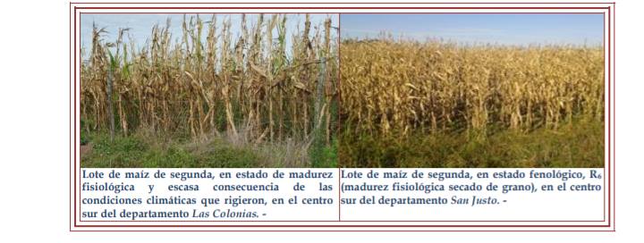 En el período comenzó un primer movimiento de equipos y cosechadoras. Pero ante las características ambientales que se registraron en la semana, con altos porcentajes de humedad ambiente y de grano, que fueron altos (20 a 25 %), similares a la semana pasada, no hubo continuidad ni progreso, quedando a la espera de un mejoramiento de las condiciones. Continuaron aumentando los grados de enmalezamiento de los lotes, como así también el deterioro de los cultivares. En los departamentos del norte del área de estudio, ante condiciones estables se avanzó en la cosecha del cultivo para silo de grano húmedo. Se observaron, en toda el área, los siguientes estados fenológicos: R “estados reproductivos” R5 (grano dentado) y los más avanzados en R6 (madurez fisiológica).